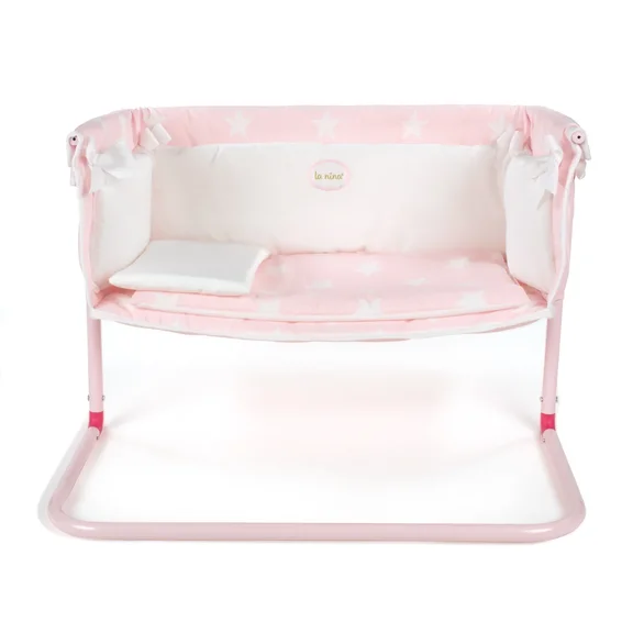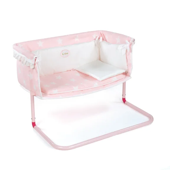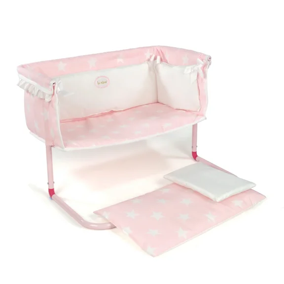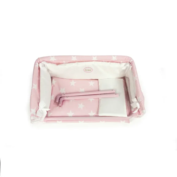 Прикроватная кровать для куклы из серии "Карлота" розового цвета с белыми звездочками. В комплекте постельное белье. Легко складывается.