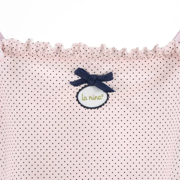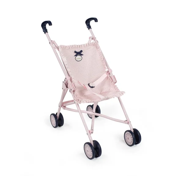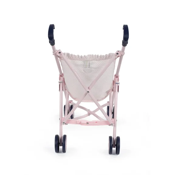Коляска-трость из серии "Шарлотта" выполнена в нежном розовом цвете с узором в мелкий синий горошек, ручки, колеса и бантики выполнены в темно-синем цвете.