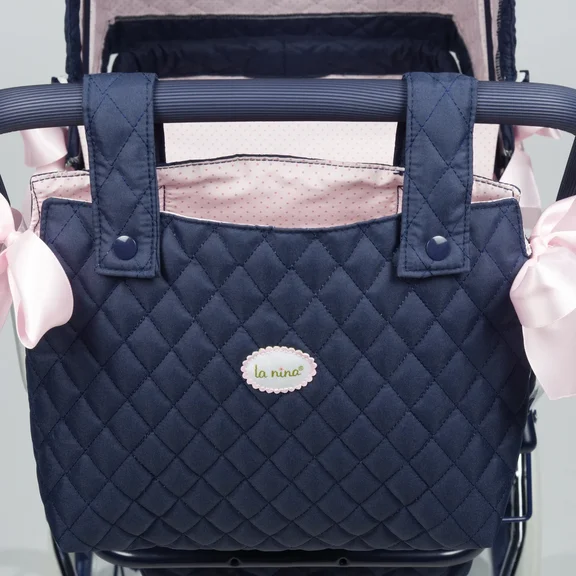 Коляска темно-синего цвета с декоративными элементами розового цвета.