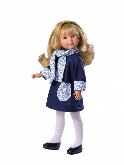 Белокурая красавица Селия, ростом 30 см, одета в нарядное, темно-синее платье с элементом в виде шарфика, аккуратно повязанное вокруг хрупкой шеи куколки.