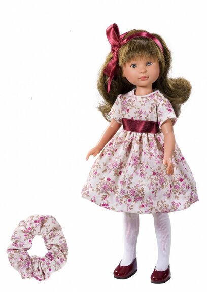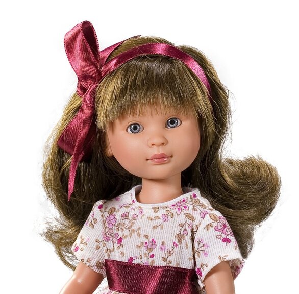 Куколка Селия - брюнетка с роскошными локонами, в шикарном нарядном платье с цветочным принтом, на талии красуется атласная лента, в тон ей повязан бант на голове. На ножках лакированные ботиночки в цвете бардо.
