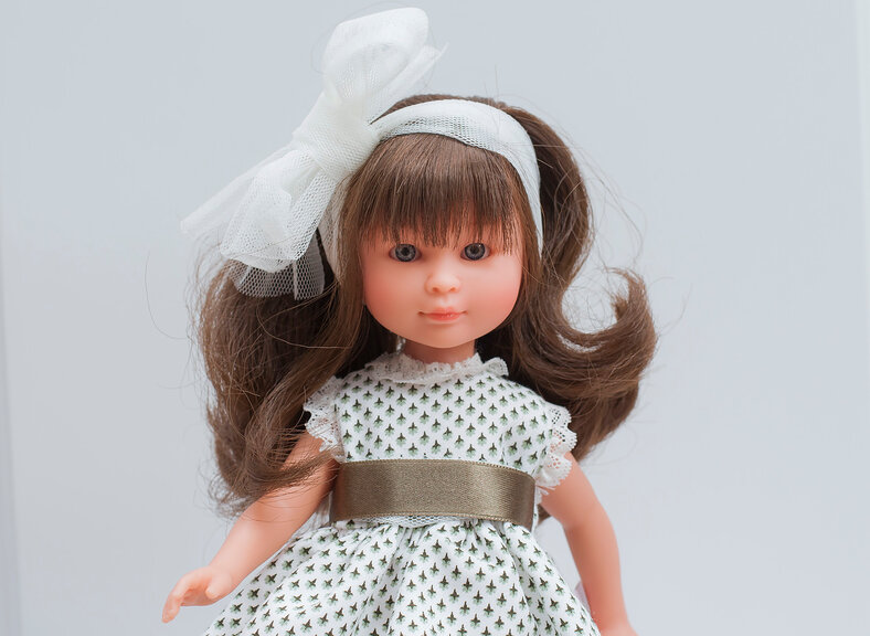 - Роскошные темно-русые волосы куклы полностью прошиты и изготовлены из качественного материала. Их слегка придерживает белоснежная лента, завязанная в бант крупного размера. Волосы куклы можно расчесывать и заплетать.