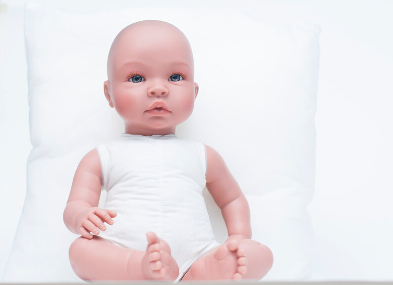 У Лео нет волос, но есть натуральные реснички. Голубые глазки, розовые полуоткрытые губки, румянец - все выглядит настолько натурально, что у вас создается впечатление, что перед вами настоящий малыш.