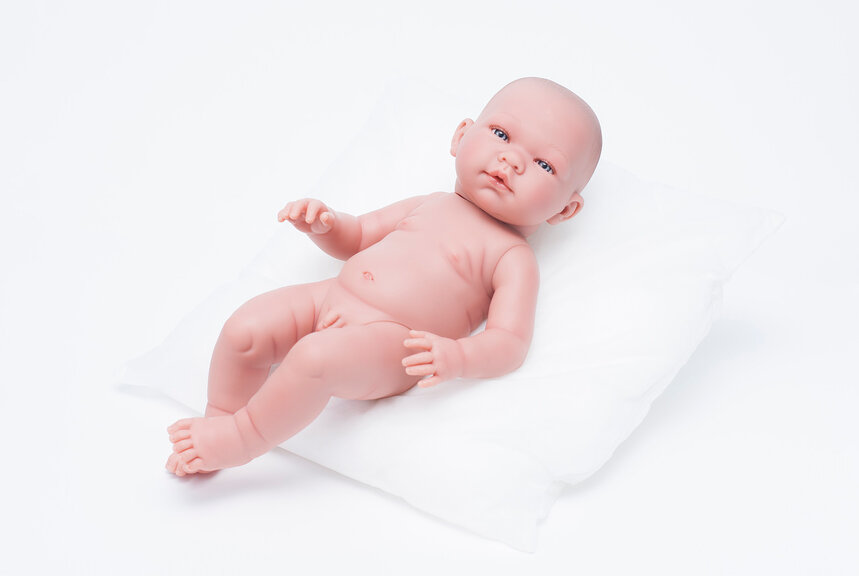 Реборн полностью выполнен из винила, без волос, имеет половые различия.