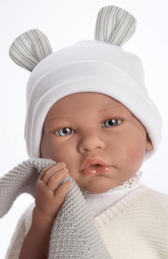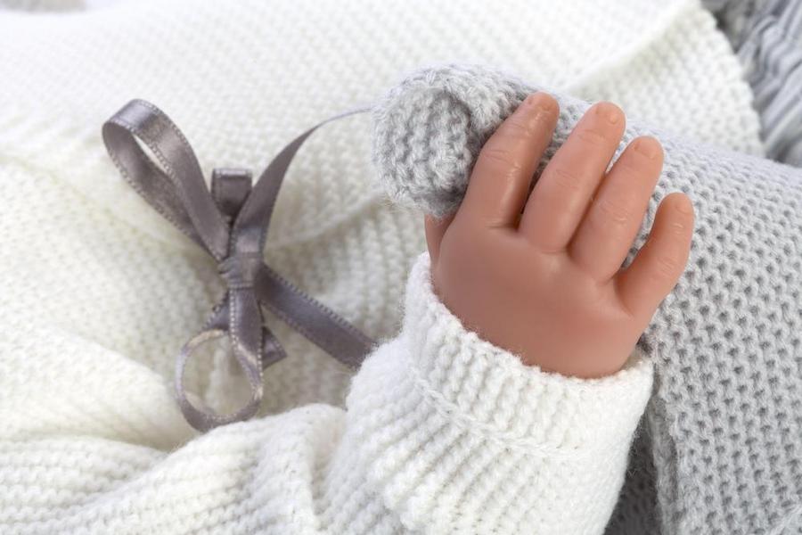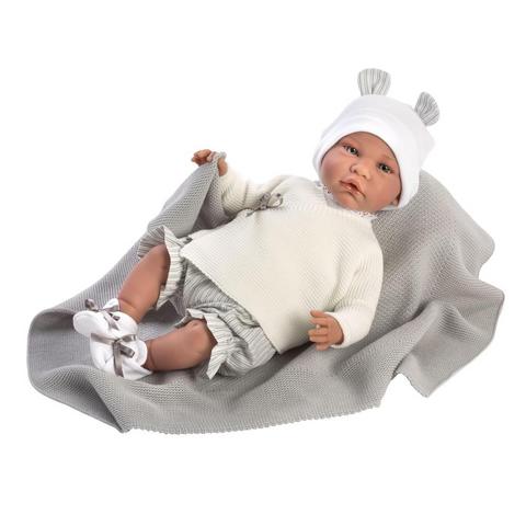 Одет мальчик в белую вязаную кофту с длинными рукавами, панталоны в серую полоску, памперс, белую шапочку с ушками и тапочки на завязках. В комплект входит серый плед и именной сертификат о рождении.