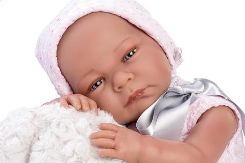 Одета Габриэла в нежный розовый комбинезон, украшенный атласными бантами сиреневого цвета, розовую шапочку на завязках и балетки, а также памперс. Реборна можно переодевать в одежду для новорожденных. В комплект также входит двухцветное плюшевое одеяло.